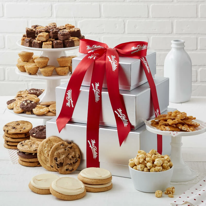 Send a shimmering box of enjoyable sweetness with our three tier Abundant Silver Cookie Tower. We include a delicious assortment of 48 Nibblers® bite-sized cookies, 48 brownie bites, 16 original cookies, 16 mini muffins, 4 frosted cookies, 2 3oz peanut brittle, and 2 4oz of toffee nut popcorn.