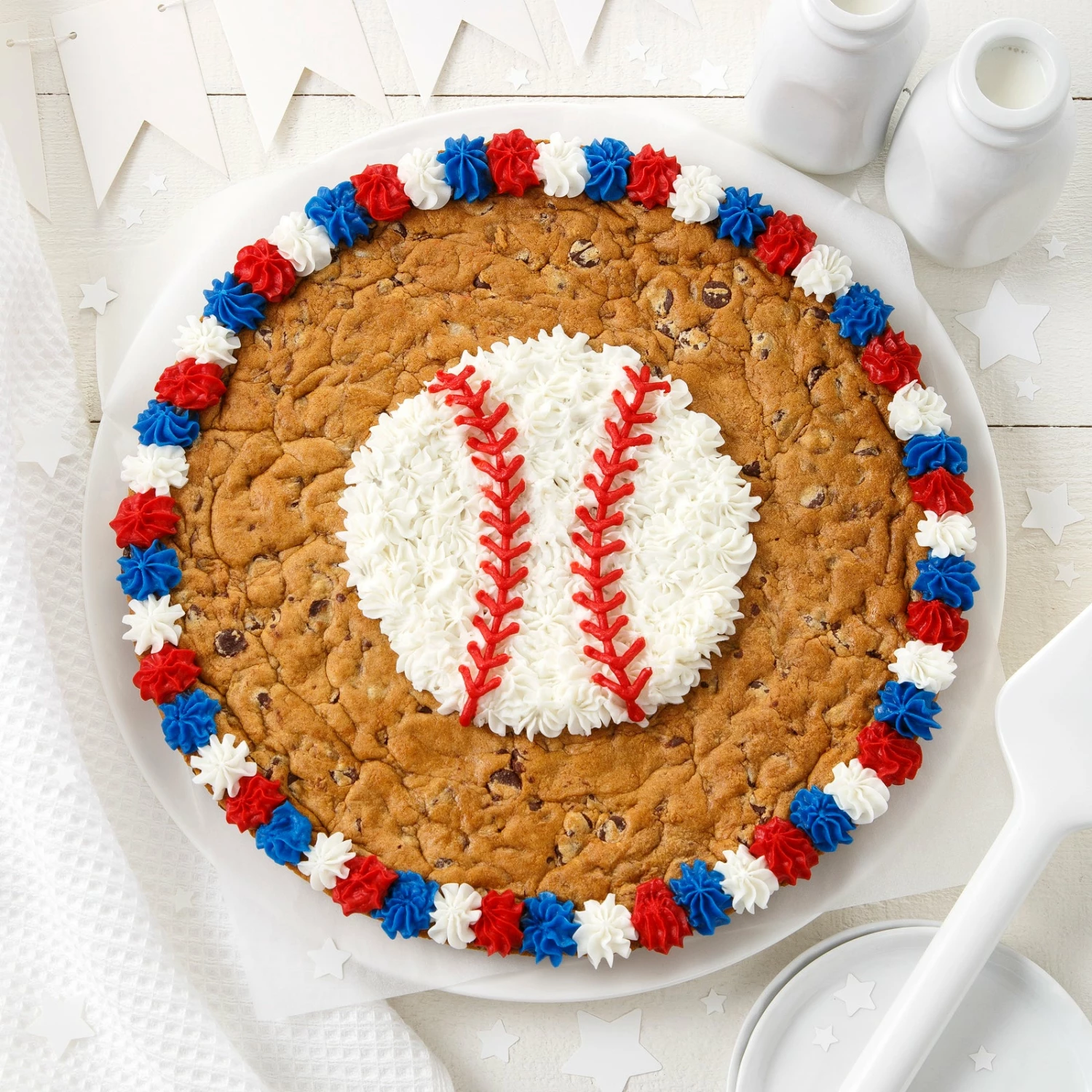 Hit a home run with the baseball fanatic in your life! Perfect for parties or a sweet treat after practice, our 12″ round semi-sweet chocolate chip cookie is decorated with real buttercream frosting and suitable for a variety of occasions.