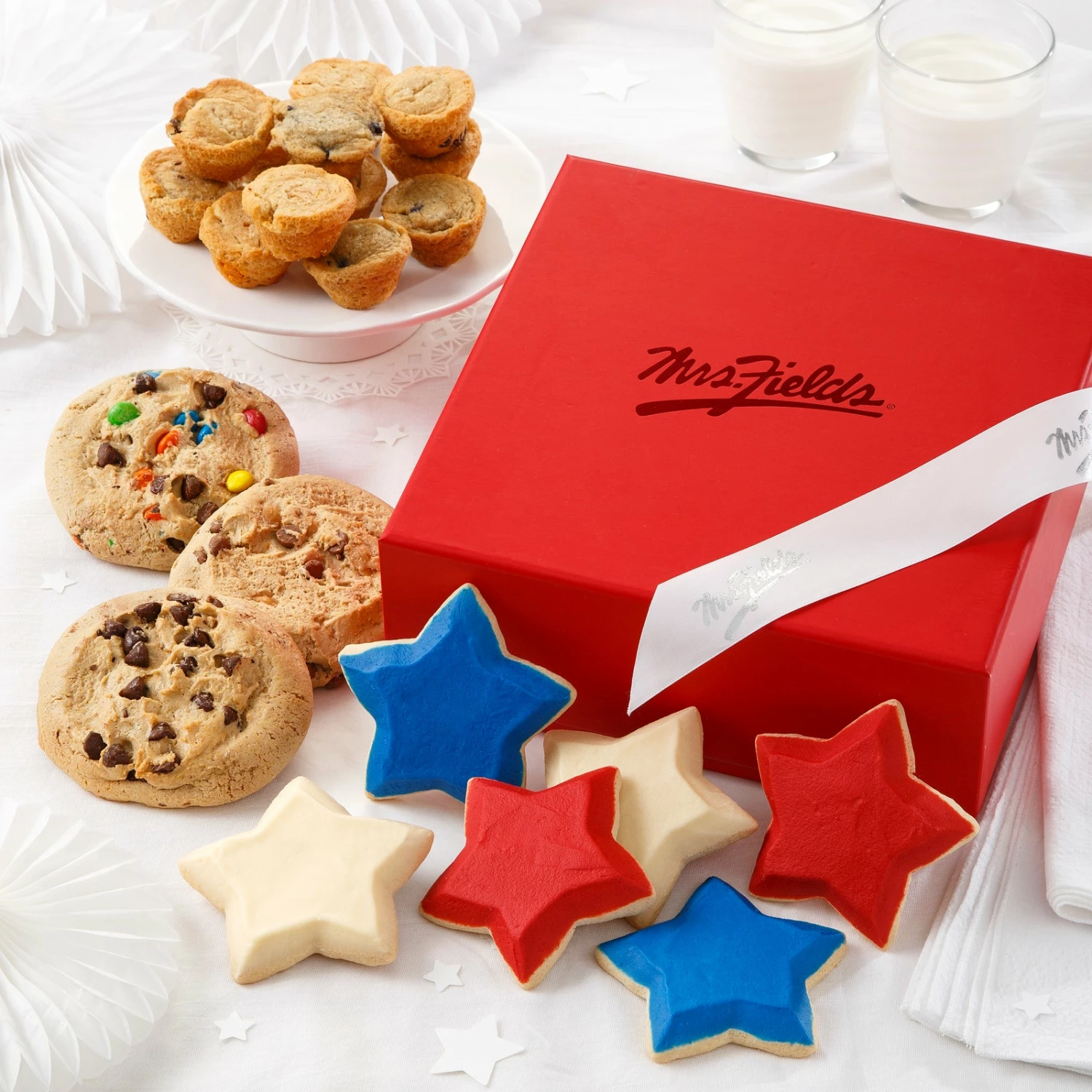 Have a blast with explosively tasty treats with our Big Bang Combo Cookie Box! This patriotic assortment comes in our classic Mrs. Fields red box and is filled with 3 mega cookies, 12 mini muffins, and 6 red, white, and blue frosted star cookies. This gift is then tied off by a beautiful white Mrs. Fields ribbon.