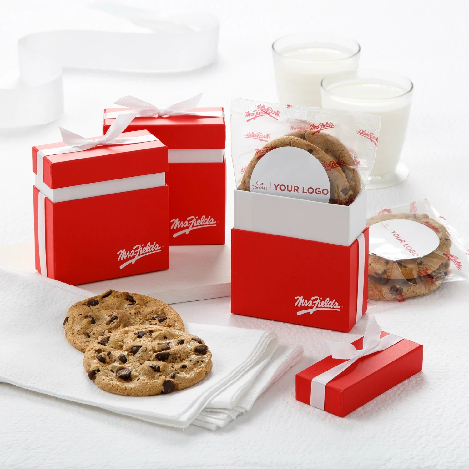 Create a moment your customers, clients, and employees won’t forget. This gift includes two chocolate chip cookies with custom stickers in a festive red box. This item is a bulk of 12 boxes.
