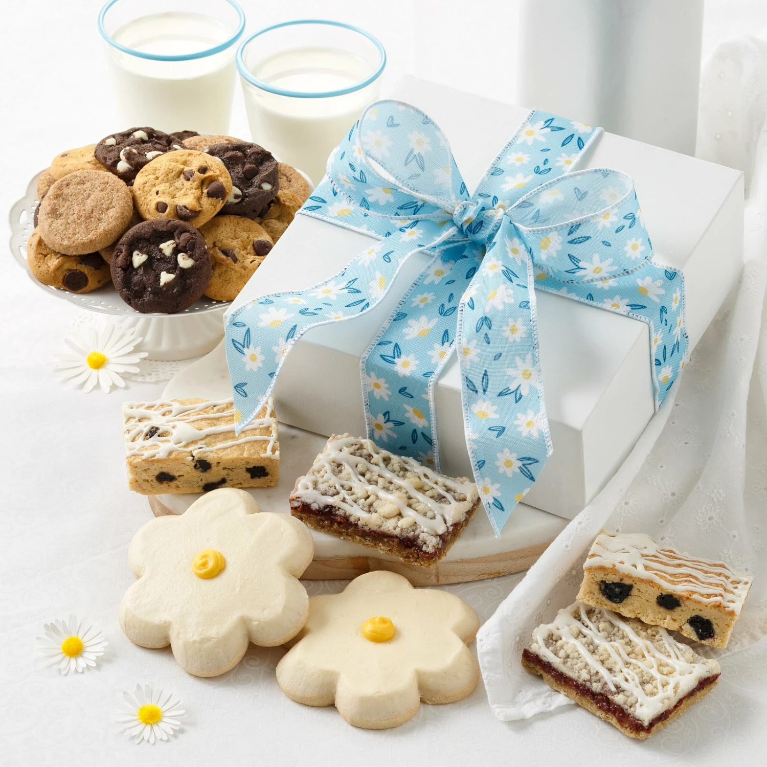 Sweet and simple, a classic white linen box is decorated with a hand-tied floral print ribbon and brimming with fresh-baked treats.