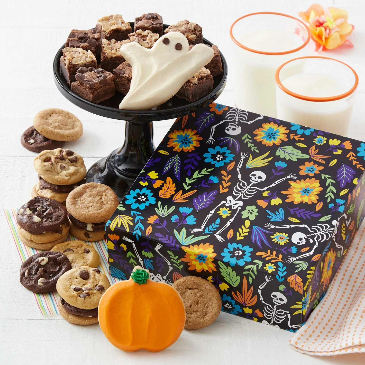 An ideal choice for revelers of any age, this artfully designed box features 18 Nibblers bite-sized cookies, 18 brownie bites, 1 frosted pumpkin cookie, and 1 frosted ghost cookie.