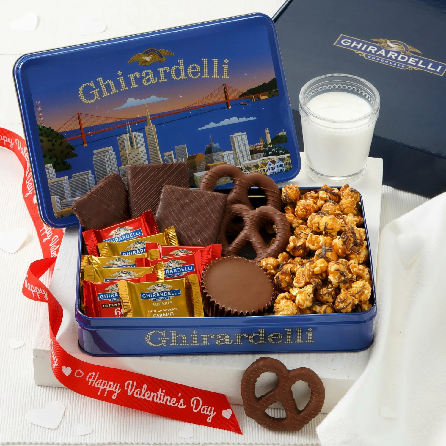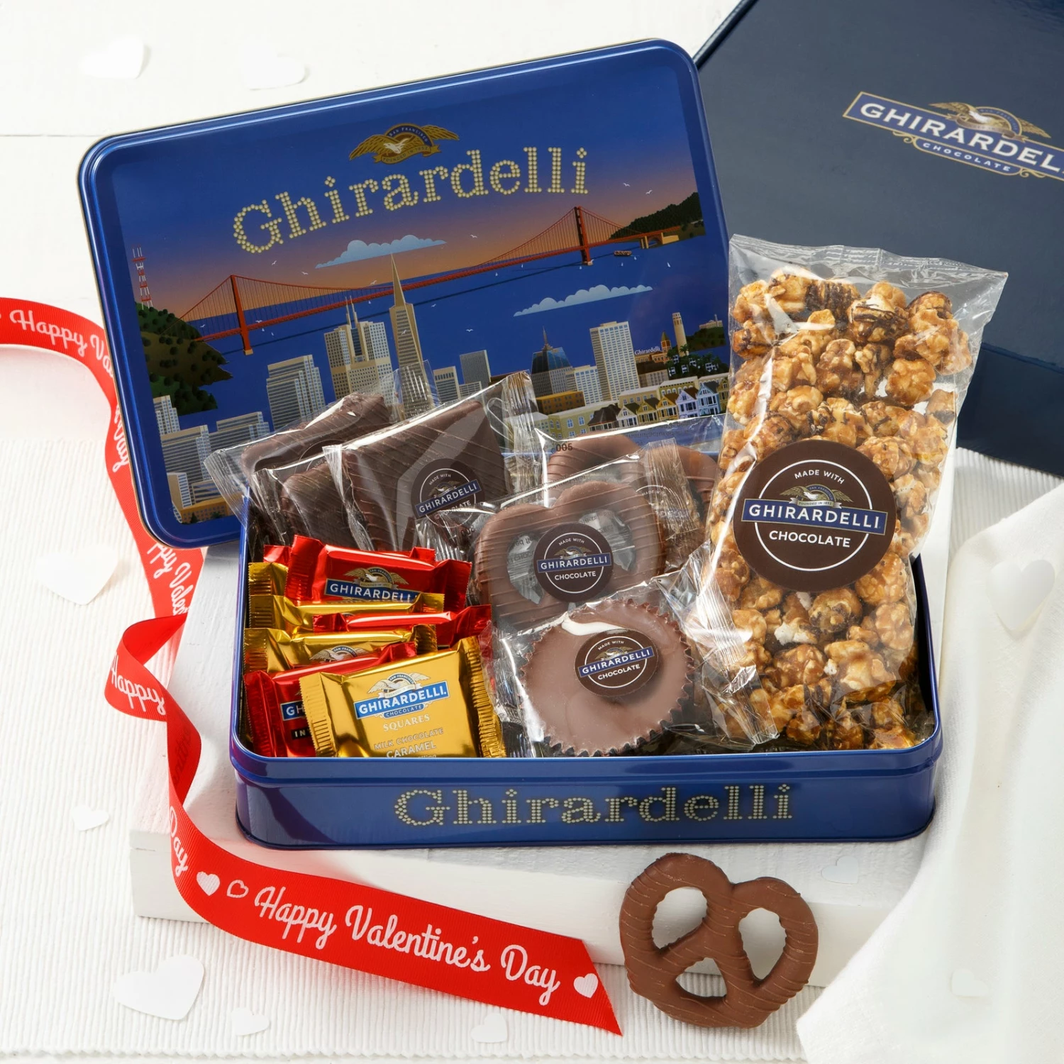 The perfect gift for the chocolate lover and the perfect amount to share. This box of Ghirardelli delights comes with5 oz. Made with Ghirardelli Dark Chocolate Drizzled Caramel Corn, 3 Made with Ghirardelli Dark Chocolate Grahams,1 Made with Ghirardelli Milk Chocolate Peanut Butter Cup, 3 Made with Ghirardelli Milk Chocolate Pretzels, 4 Ghirardelli 60% Dark Chocolate Squares, 4 Ghirardelli Milk Chocolate Caramel Filled Squares, Happy Valentines Day Ribbon.