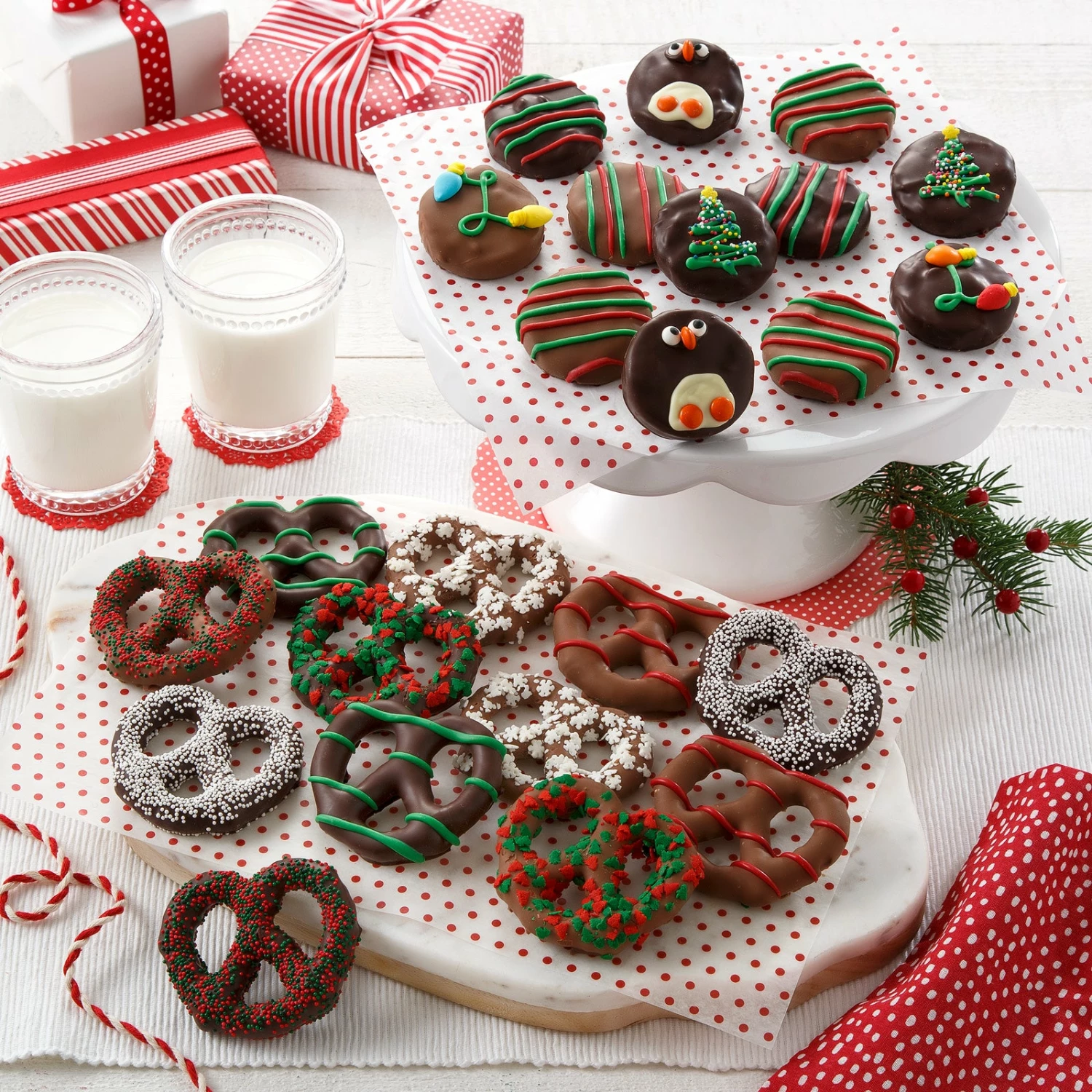 Send the ultimate holiday gift with this combo of 12 pretzels and 12 Nibblers bite-sized cookies! Each enrobed in Belgian chocolate and then hand-decorated with a festive Holiday theme of lights, penguin, trees, drizzled icing and sprinkles. Crafted by artisans in a small batch kitchen, no two will looks exactly the same.