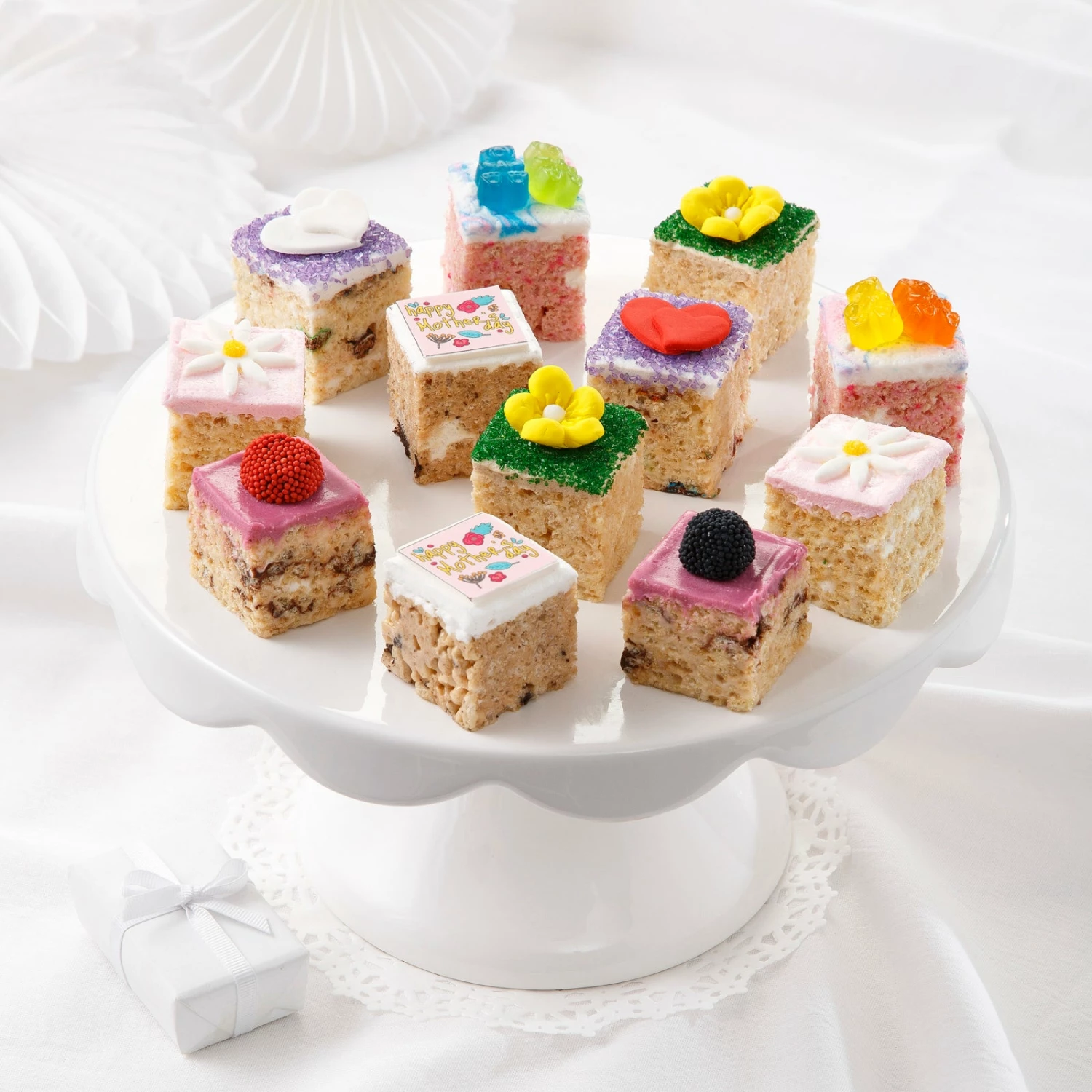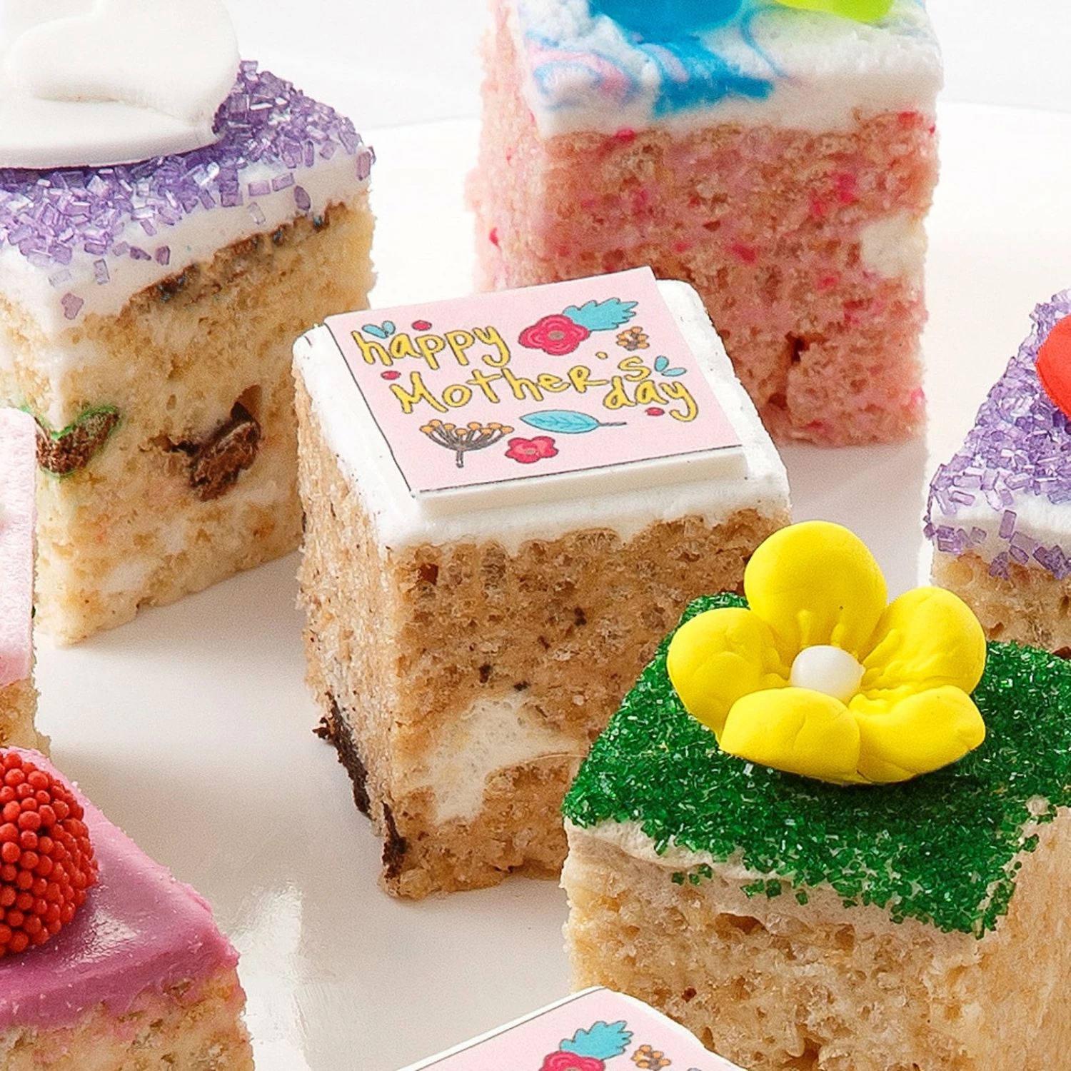 Send a Mother’s Day gift that is sure to delight! This gift is filled with 12 mini rice krispies and measure: 1.5″ x 1.5″ x 1.75″ . Treats arrive in a Treat House gift box with Mrs. Fields red gift ribbon. All rice krispie treats are hand-made and uniquely decorated just for you.Â