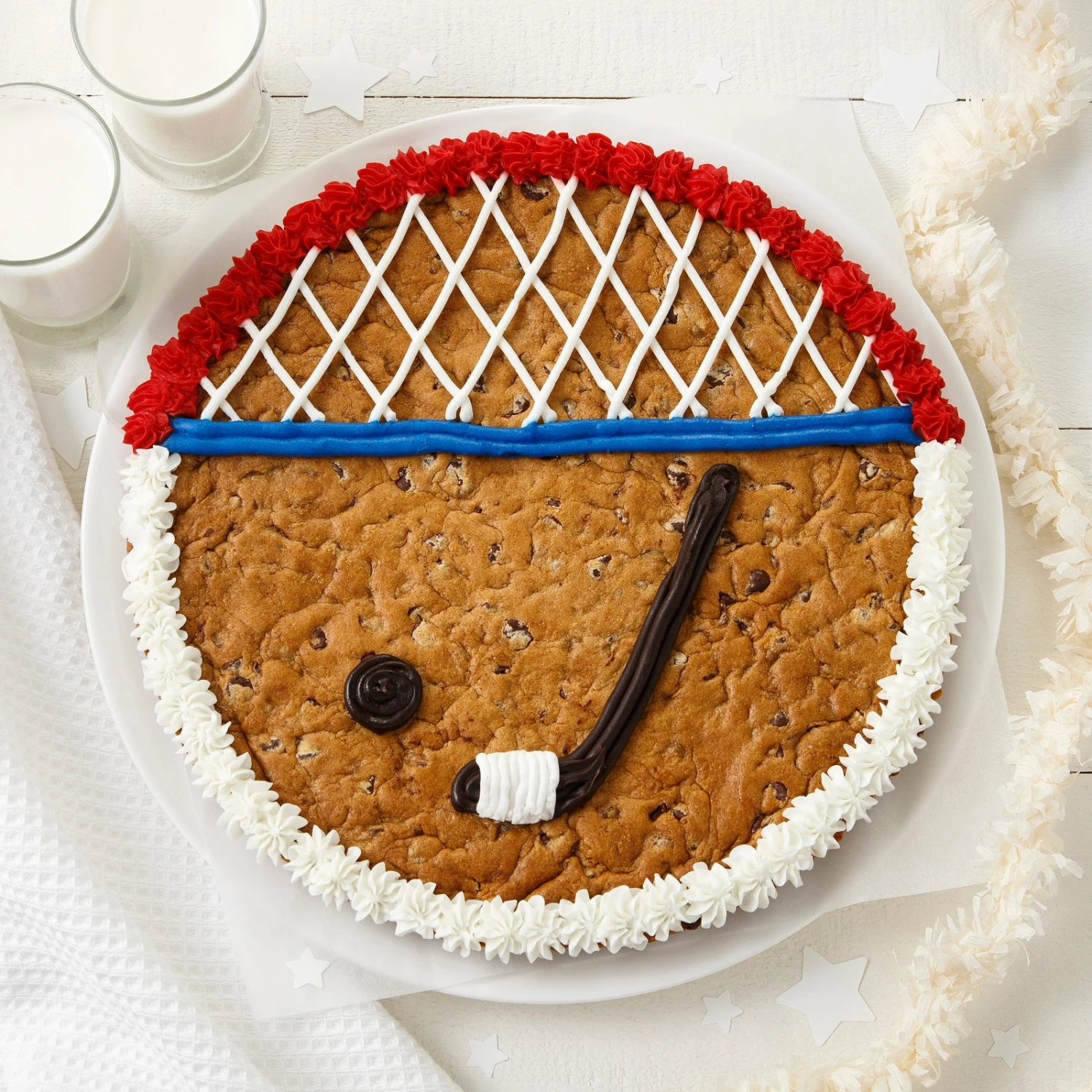 You’ll score big points with the hockey fan in your life with our hockey themed cookie cake. Perfect for birthdays or a team celebration, our classic semi-sweet chocolate chip cookie is baked fresh and perfect for sharing.