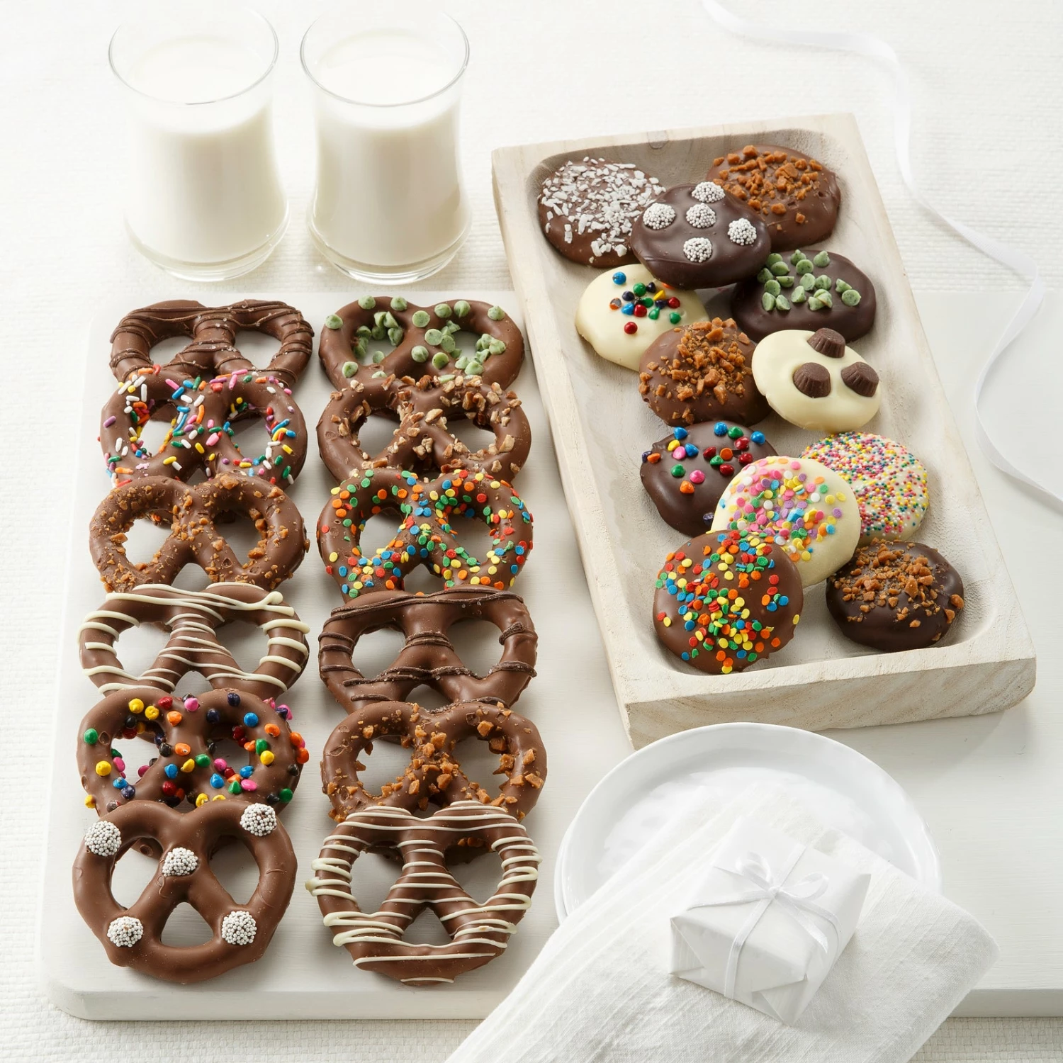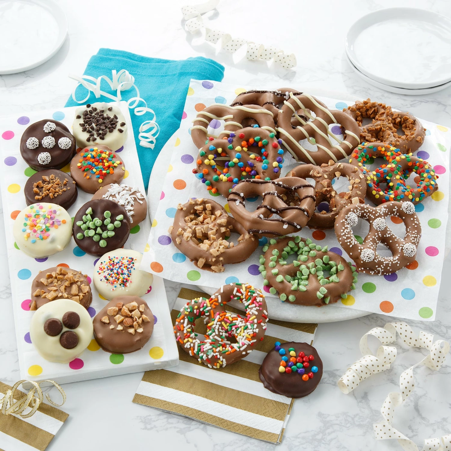 Send the perfect celebration gift with this combo! Each treat is enrobed in Belgian chocolate and then hand-decorated with chocolate drizzle, colorful sprinkles and candy. Great gift for a birthday, thank you, thinking of you or any occasion. Crafted by artisans in a small batch kitchen, no two will looks exactly the same.