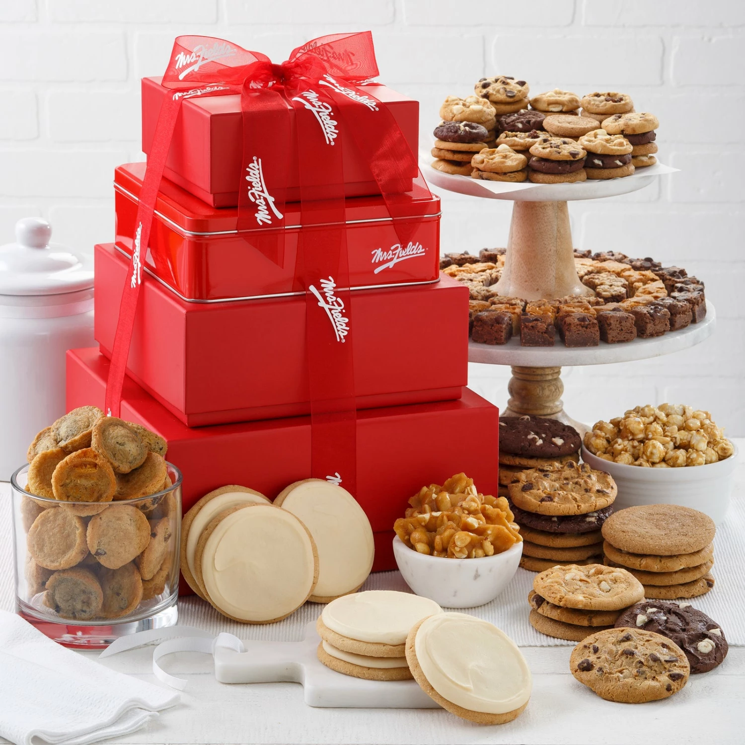 Introducing the Crimson Collection! Our new sophisticated Ultimate Crimson Cookie Tower is a gift of good taste, secured in a package that’s almost as appealing as its contents. We includes a delicious assortment of 75 Nibblers® bite-sized cookies, 60 brownie bites, 20 original cookies, 24 mini muffins, 6 frosted cookies, 2 3oz peanut brittle, and 1 4oz toffee nut popcorn.