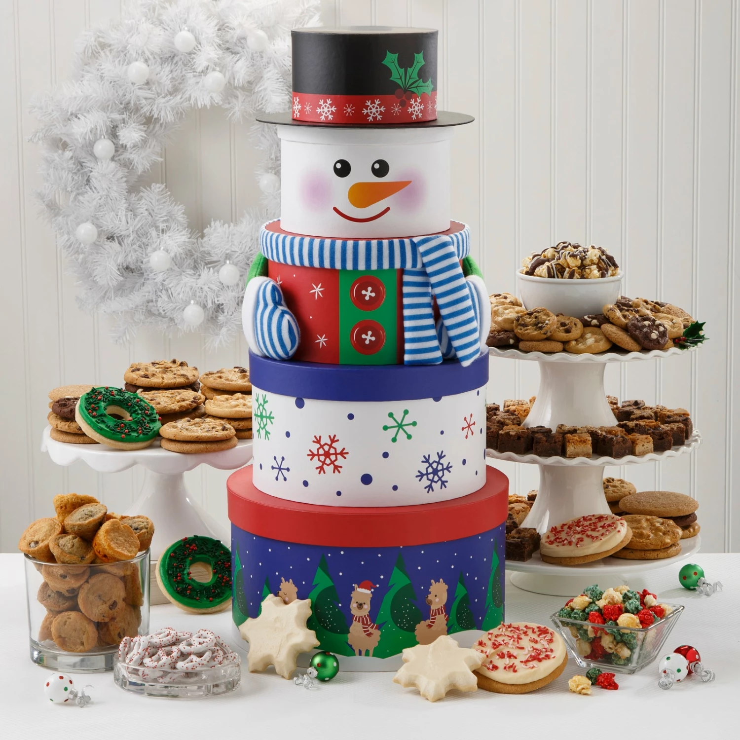 Our biggest bundle of joy is composed of 5 separate boxes of holiday delight. Includes 48 Nibblers® bite-sized cookies, 54 brownie bites, 30 original cookies, 24 mini muffins, 2 frosted wreath cookies, 2 frosted snowflakes, 2 frosted peppermint cookies, 4 oz of holiday popcorn, 4 oz of chocolate drizzle popcorn and 3 oz. yogurt covered pretzel twists.